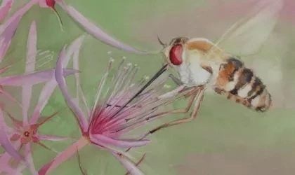 Alison Worsnop has captured in watercolour, mixed media and charcoal some of the interactions between flowering plants and animals observed over years on her woodland in Humpty Doo – from native bees to gliders. This exhibition is a delightful and attentive record of disappearing native fauna and flora.