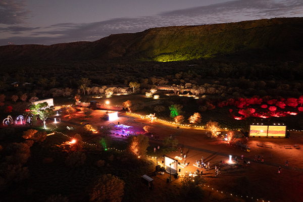 DUSK DESCENDS IN the desert. People wind their way on buses and trails towards the Alice Springs Desert Park, catching glimpses of lights dancing across the range and sky. Getting closer, a soundscape emerges, blending music, storytelling, and language. Getting even closer, festoon and lanterns light the way in.