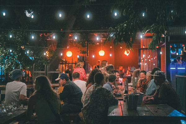 RETRO RED LOUNGES adorn the garden, and fairy lights drape over the eucalyptus trees – a perfect setting for a venue with a passion for travelling, as a bar and music venue, attached to an iconic backpacker establishment.